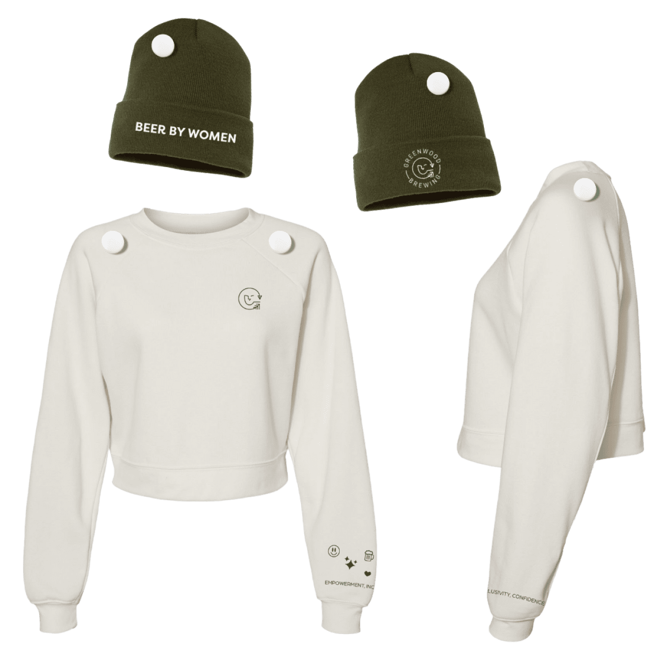 + GWB Iconic Cropped Crewneck in Cloud White. Logo on chest. Sleeve design includes beer, smiley face, star and heart icons + words “empowerment, inclusivity, confidence” (aka our brand values)