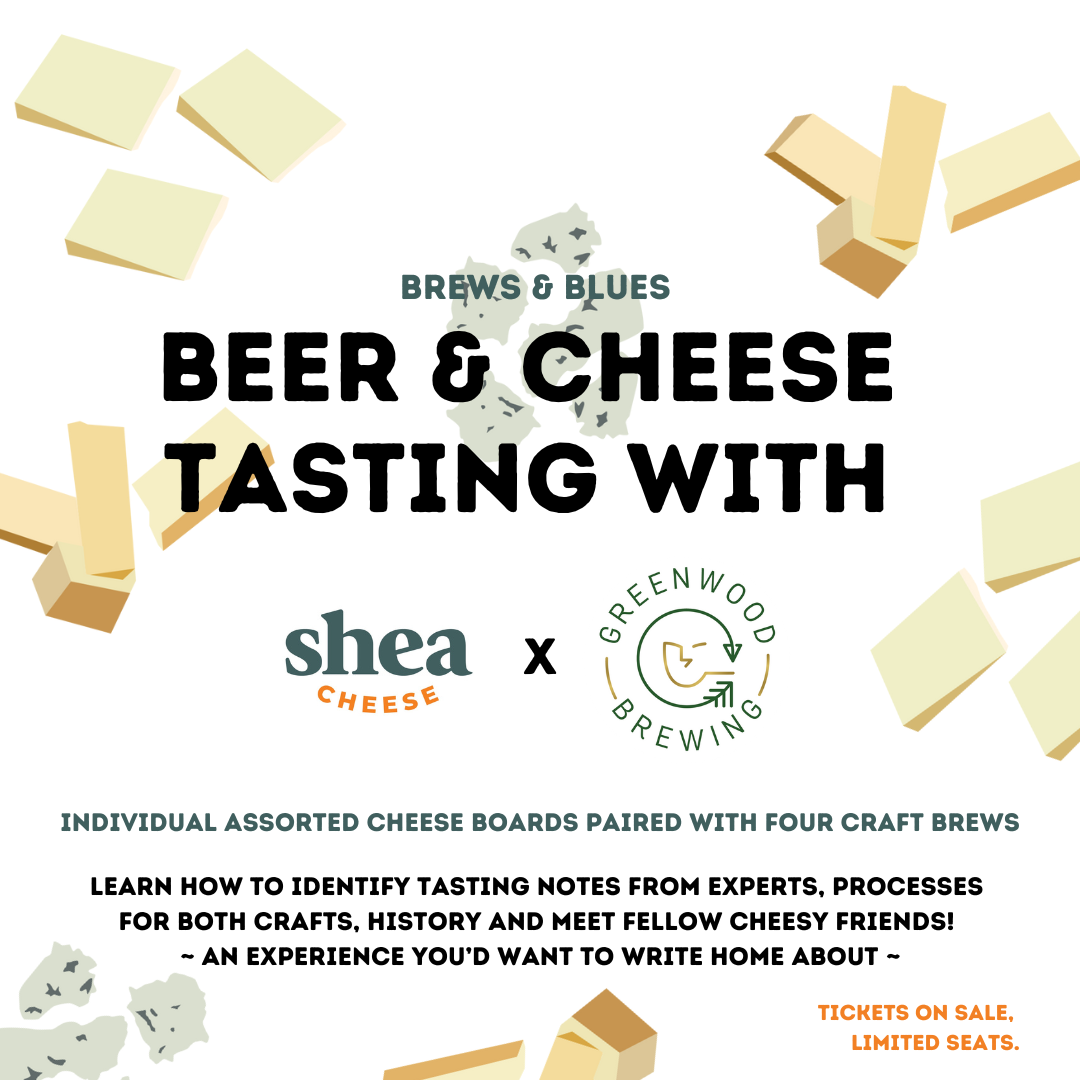 Enjoy communal style sitting in the Greenwood Brewing Beer Garden while tasting and talking about Shea Cheese’s modern cheeses paired with Greenwood Brewing’s craft brews (4oz taster sizes), expertly paired by Greenwood Brewing’s Head Brewer Kristin L. and Associate Brewer Anthony M.