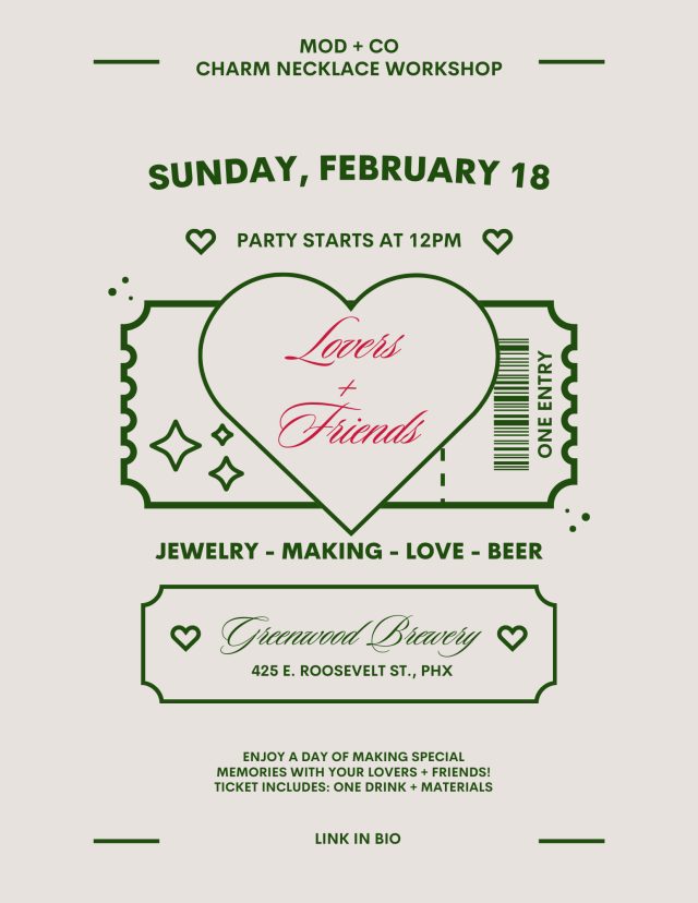 Join us at Greenwood for a fun and interactive Charm Necklace Workshop where you can create your own custom charm necklace! Immerse yourself in a hands-on crafting experience as you design and assemble your one-of-a-kind piece. And the best part? You can enjoy a refreshing Greenwood Beer while you unleash your creativity. Don’t miss out on this unique opportunity to have a great time and make lasting memories – bring a friend or make some new ones along the way!